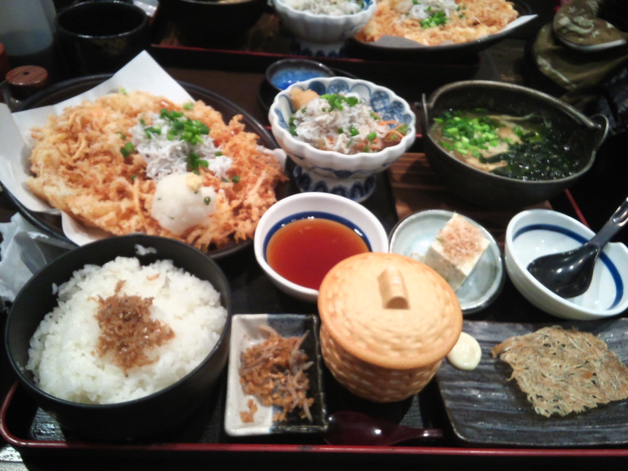 夕ご飯は弁財天仲見世通りにある「とびっちょ」っていうお店で「しらすざんまい御膳」食べてきました。サラダの上にもかき揚げの上にもご飯の上にもしらすがどーん!!お豆腐とお吸い物、茶わん蒸しの中にも入っていて、もちろんタタミイワシもあり…もうホント、その名にたがわず「シラス三昧」。