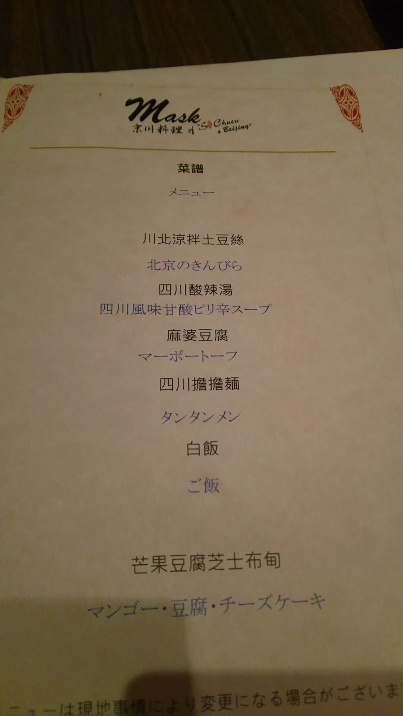 ここが夕食を食べたレストラン。「マスク」という四川料理屋さんです。(お店の紹介では「京川<北京・四川>料理店」ってなってたんだけど、旅行会社さんの案内では「四川料理店」だった。どちらかというと四川料理がメインなのかな…?)