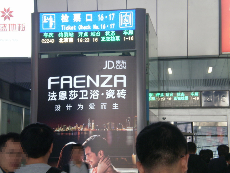 とはいってもやはり気が気じゃなかったですねー。自分達が乗る列車が電光掲示板に現れるも時間になっても「候车」から「正在检票」に変わらず、その内電光掲示板から姿を消し、また現れ…(なお、上の写真は一旦消えて再表示されたものです)。表示が気になっちゃってもう掲示板ガン見状態。とてもじゃないけど座ってゆっくり休むなんて状態じゃありませんでした。