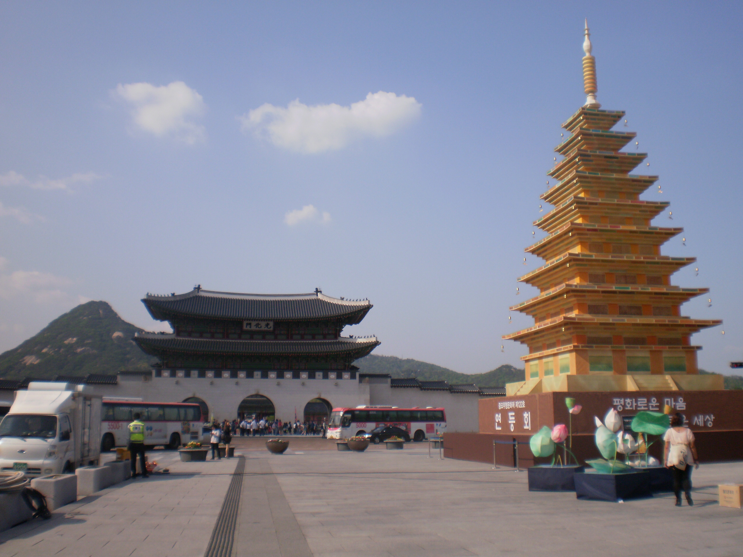 この写真の手前右にある金の塔はお釈迦様の誕生日を祝うためのものだそうです。韓国ではお釈迦様の誕生日も旧暦で祝うのだとか。