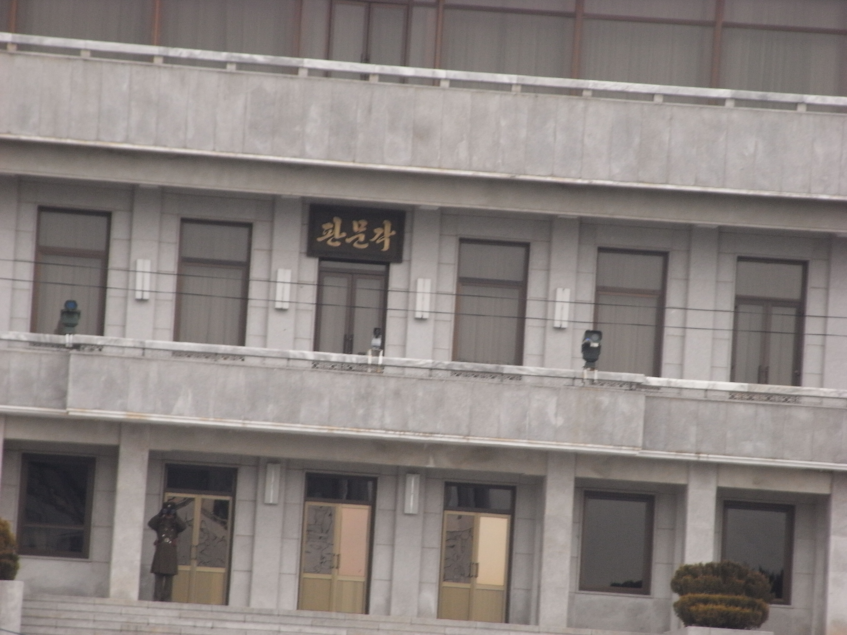 唯一見れたのは10枚目の写真奥にある灰色の北朝鮮の建物(板門閣)の入り口(石の階段上がったところ)に立っている兵士さん。家帰って写真をよく見てみたらこちらを双眼鏡で覗いてました。監視してたんだろうか。