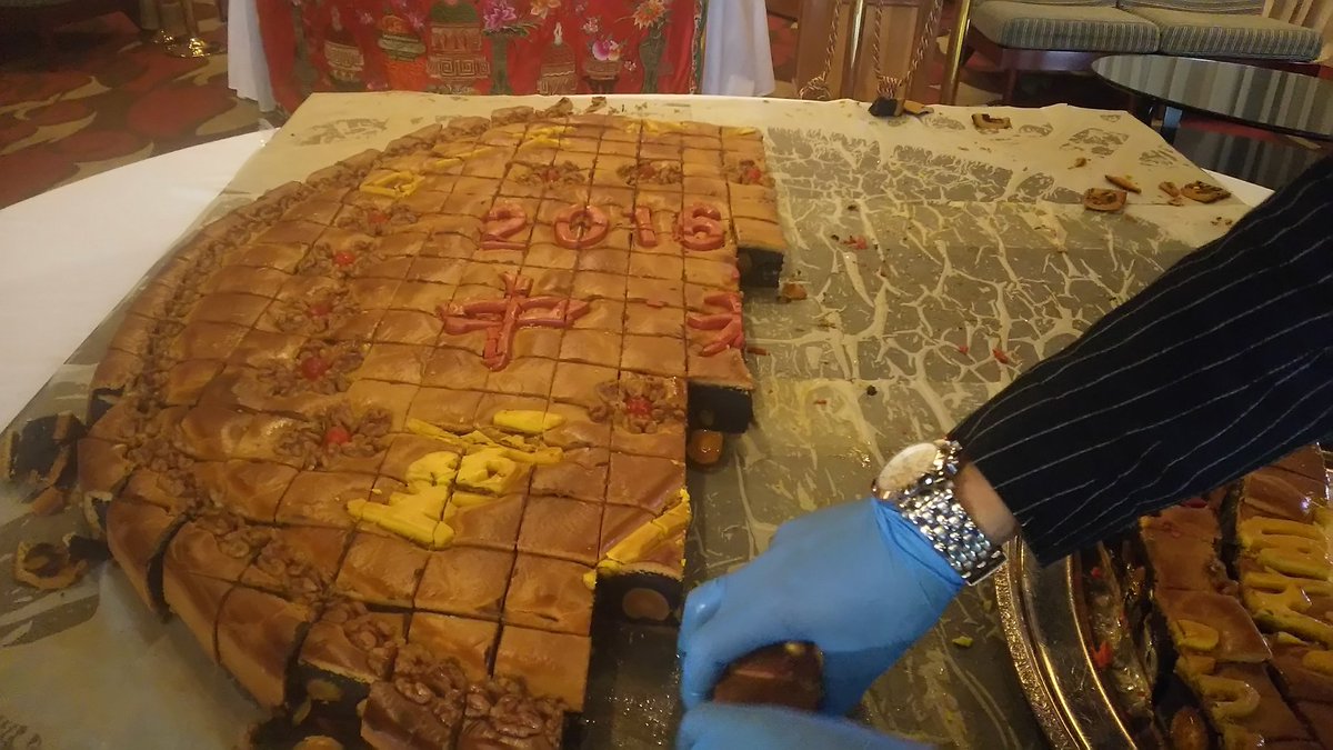 …というわけで、ローズホテルの巨大月餅切り分け・無料配布が始まる30分前(11時頃)にローズホテル着。「毎年長蛇の列!」とは聞いてたんですけど、30分前なのにすごい列でしたね(1階の入り口ロビーから階段上って2階の宴会場の廊下?まで人ビッシリ!な感じで)。私の前に並んでる人達が話してたのですが(後日新聞にも載ってたのですが)、一番早い人だと朝9時頃から並んでいたとか…。